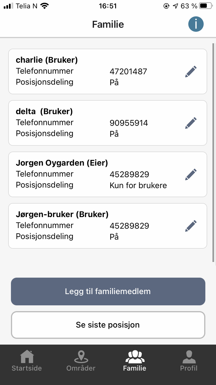 - ”Eiere”; kan løse ut alarmen, administrere områder og familie, men har ikke mulighet til å få posisjonsvarsler fra andre ”eiere”.